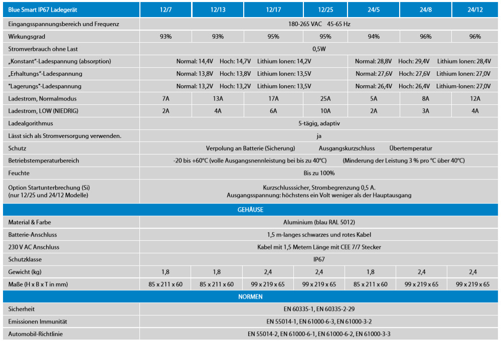 In tegenstelling tot andere merken zal de Blue Smart IP67-oplader (waterdicht) proberen een diep ontladen batterij op te laden door er een zwakke laadstroom op te forceren. Het normale laadbedrijf wordt dan hervat zodra er voldoende spanning tussen de accu-aansluitingen staat.
